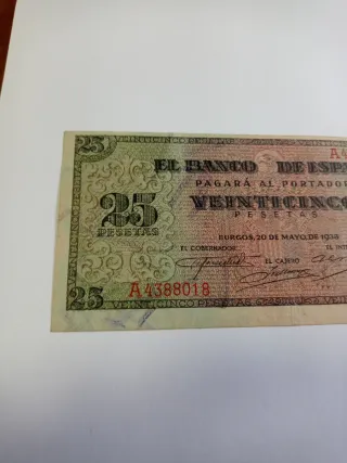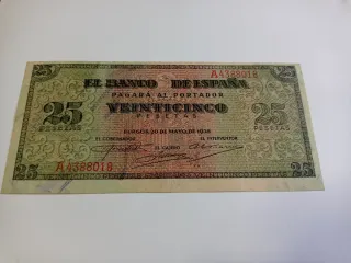 Billete de 25 pesetas del Banco de España, emitido en Burgos el 20 de mayo de 1938. - Serie A, número de control A4388018. - Diseño con El Banco de España y Pagaré al portador. - Firmas de El Gobernador, El Interventor y El Cajero.