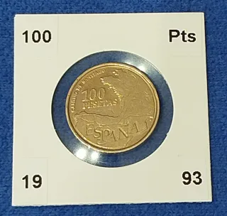 Moneda conmemorativa de 100 pesetas de España, año 1993. - Diseño del Camino de Santiago. - Grabado ESPAÑA en el reverso.