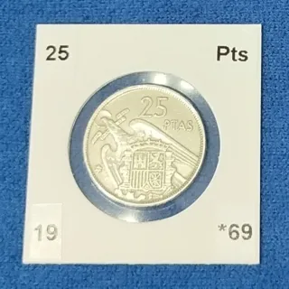 Moneda de 25 pesetas del año 1957*69 - Diseño con águila y escudo. - Inscripción LIBRE y UNA GRANDE LIBRE. - Valor 25 PTAS visible.