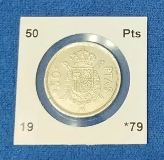 Moneda de 50 pesetas del año 1975. - Diseño con escudo y corona. - Inscripción PTAS y 50.