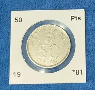 Moneda de 50 pesetas de España del año 1982. - Diseño con balón de fútbol y el número 82. - Inscripción ESPAÑA y PESETAS. - Detalles de estrellas a los lados.