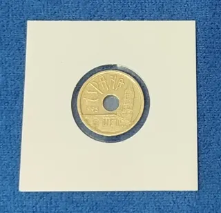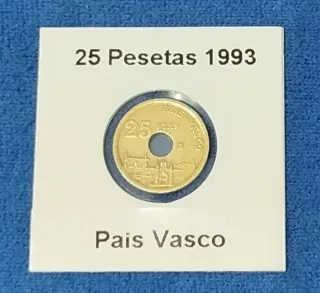 Moneda de 25 pesetas del año 1993. - Diseño con edificio y agujero central. - Inscripción PAIS VASCO y 25 PTAS.