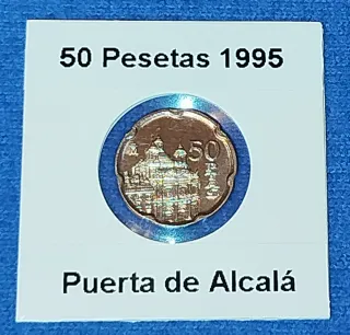 Moneda de 50 pesetas del año 1995. - Diseño con edificio y número 50. - Borde ondulado.