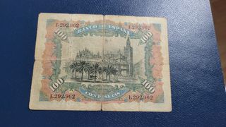 Billete de 100 pesetas del Banco de España, emitido en Madrid el 15 de julio de 1907. - Valor: 100 pesetas. - Fecha de emisión: 15 de julio de 1907. - Lugar de emisión: Madrid. - Serie: 1.292.962.