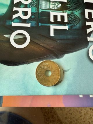 Moneda de 25 pesetas de España. Presenta un diseño con un agujero central y grabados. - Número 25. - Grabado WAS CAM y una M. - Diseño superior con figuras. - Material metálico.