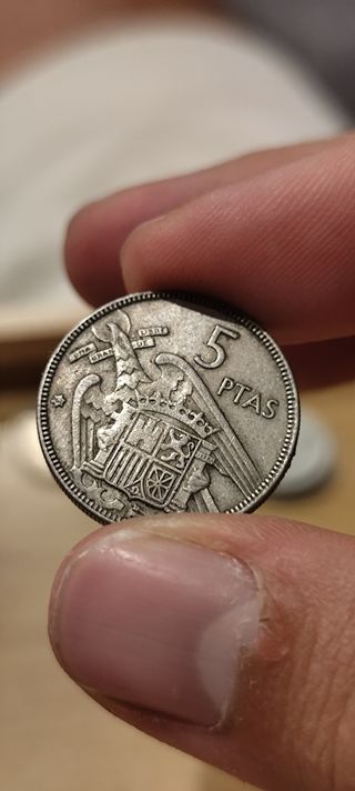 Moneda de 5 pesetas, también conocida como un duro, del año 1949. - Diseño con PESETAS en la parte superior. - Inscripción CINCO en la parte inferior. - Con la cara de Francisco Franco. Las fotos no hacen justicia, lo sé. Las he hecho sin ampliar. SÓLO SE HARÍA LA VENTA EN PERSONA. Escucho ofertas.