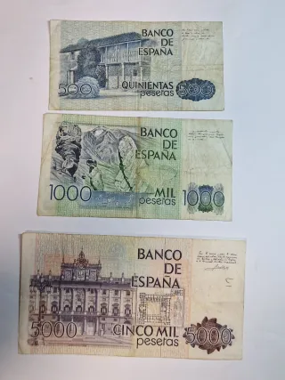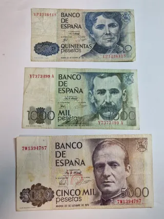 Lote de billetes de pesetas de España de 1000, 2000, 5000 pesetas de 1979 en buen estado. Ideal para coleccionistas, aficionados a la historia o quienes buscan piezas con valor sentimental. Puedes combinar varios billetes de mi perfil para ahorrar en el envío. Envío: Correos ordinario por solo 1 € o certificado por 5 € (con responsabilidad del comprador). . Peseta, pesetas, españa, coleccionismo, numismática, antigüedades, billetes antiguos, coleccionables, colecciones, coleccionismo, lote, moneda, monedas, filatelia, notafilia, billetes, billete, peseta.