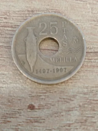 Moneda conmemorativa de 25 pesetas. - Conmemora el V Centenario de la presencia española en Melilla. - Año de emisión: 1997. - Diseño con ánfora y ondas marinas.