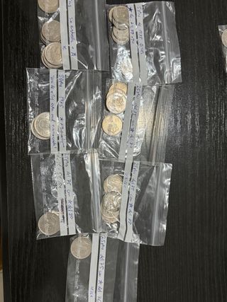 24 de un duro, una de 5 pesetas, 4 de dos pesetas y 7 de diez pesetas. De 1957,1959, 1975 y 1980 las de duro. De 1982 las de dos pesetas. Del 83/84/85 las de diez pesetas Precio negociable