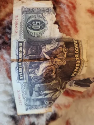 Billete de 50 pesetas del Banco de España, emitido en 1931. Presenta un diseño detallado con figuras. - Denominación: 50 Pesetas - Emisor: Banco de España - Año de emisión: 1931 - Serie: 3.398.662