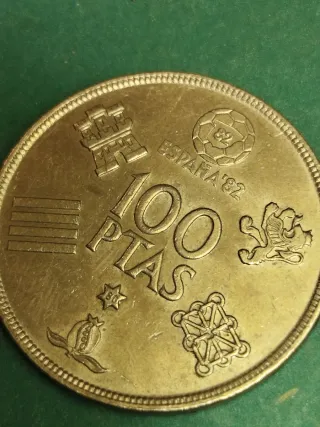Moneda conmemorativa de 100 pesetas de España, año 1980. Destaca el diseño del Mundial 82. - Anverso: Escudo de España. - Reverso: 100 PTAS en el centro, rodeado de símbolos como un castillo, un balón de fútbol con 82, un león rampante, una granada y una cruz. - Borde con cordoncillo.