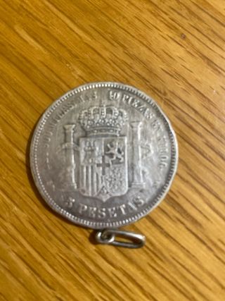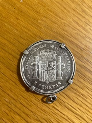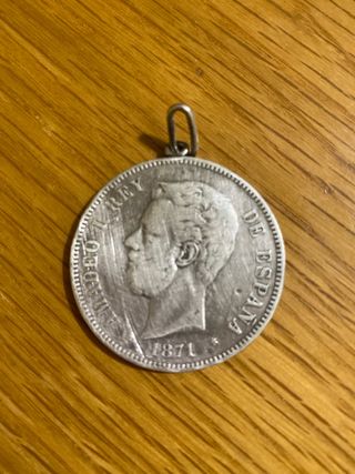 Moneda de 5 pesetas del año 1871, con la efigie del Rey Amadeo I. Con anilla para colgante - Canto con leyendas. - Diseño detallado de la efigie. - Año de acuñación: 1871.