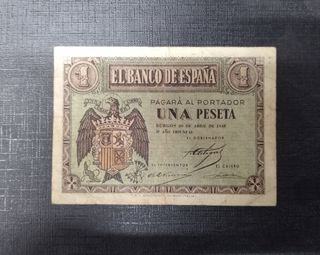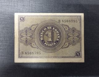 Billete de una peseta del Banco de España, emitido en Burgos el 30 de abril de 1938. Serie B - Diseño con el escudo de España y águila. - Texto II Año Triunfal. - Impreso por C. C. Banconote Milano Italia.