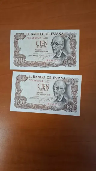 Se venden dos billetes de 100 pesetas de España, emitidos en 1970. Son billetes correlativos. - Banco de España. - Serie 7E. - Fecha: 17 de Noviembre de 1970. - Número de serie: 7E9506222 y 7E9506223.