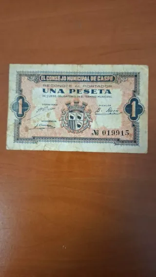 Billete local de 1 peseta emitido por el Consejo Municipal de Caspe. - Reconoce al portador una peseta. - De curso obligatorio en el término municipal. - Número de serie: 019915. - Firmado por Depositario, Interventor y Alcalde.