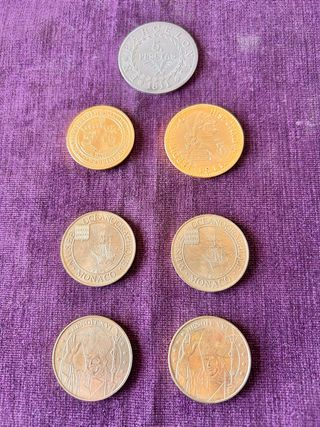 Conjunto de siete monedas conmemorativas de diferentes diseños y épocas. - Una moneda plateada de 5 Pesetas 1811 de Barcelona facsímil - Dos monedas doradas con grabados históricos facsímil - Dos monedas de Musee Oceanographique Monaco con un barco año 2000 - Dos monedas con la imagen de Benedicto XVI jubileo Lourdes año 2008 - negociable - se entrega en persona 607941245