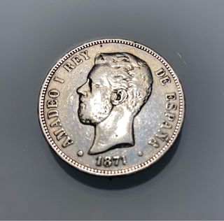 Moneda conmemorativa de Amadeo Rey de España acuñada en 1871. - 5 pesetas - Diseño detallado del perfil del rey. - Año de acuñación: 1871.