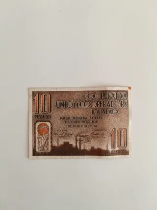 Billete de papel moneda social de curso interior de la Cooperativa Unió de Cooperadors de Igualada. - Valor: 10 Pesetas. - Fecha: 1 de gener de 1938. - Diseño con imagen de cooperativismo y silueta industrial.