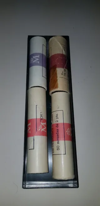 Se vende lote de 4 rollos de monedas antiguas. - Dos rollos de 50 monedas de 2 pesetas. - Dos rollos con M y corona, de Fábrica Nacional de Moneda y Timbre. W1 tesoro