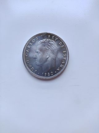 Se venden mas unidades . Año:1980 Variedad :1980 Tirada :20.041.000 Anverso La moneda presenta un perfil dignificado de Juan Carlos I, capturando su papel en la historia de España y sirviendo como un recordatorio de su influencia durante su reinado. Reverso En el corazón de la moneda se encuentra la denominación, rodeada por un mosaico de emblemas que reflejan la rica herencia de España y simbolizan la unidad y diversidad de la nación. Grosor: 2,4 mm Borde: Grabado Diámetro: 34,0 mm Peso: 17,0 g Acuñación 20.041.000 Composición Cuproníquel Número de Krause 820