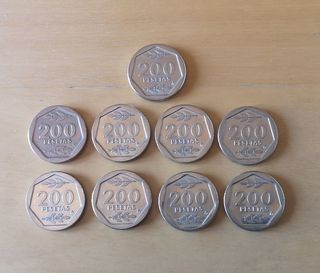 Lote con 9 monedas 200 pesetas España. Impolutas conservadas como recién sacadas de rollo. Ideal coleccionismo. ENVÍO GRATUITO POR CORREO ORDINARIO. Tags: monedas colección, numismatica, moneda rara, colección monedas, monedas antiguas, pesetas, moneda conmemorativa, plata, cobre, plata de ley, plata 925, FNMT, fabrica nacional moneda, moneda española.