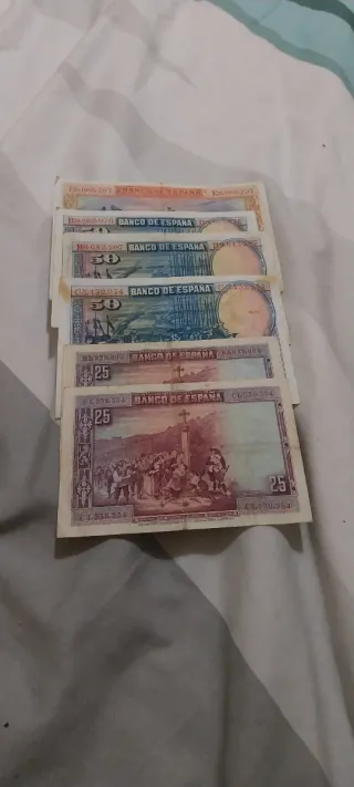 Colección de cinco billetes antiguos de peseta española. Son piezas únicas para coleccionistas. - Incluyen billetes de 1, 5,10, 25 y 100 pesetas. - Los billetes muestran señales de desgaste acordes a su antigüedad, pero se encuentran en buen estado general. - Perfectos para añadir a una colección de billetes históricos. - También se venden sueltos