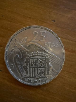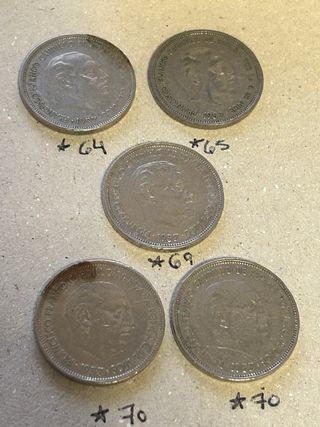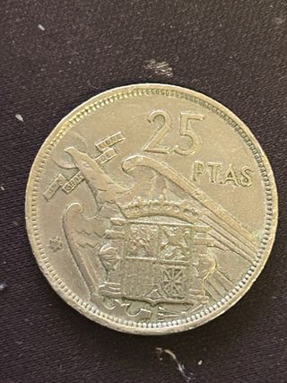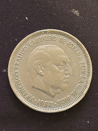 Moneda de 25 pesetas del año 1957. Esta pieza pertenece a la serie de monedas con estrellas. - Estrella: 64, 65, 69, 70 y 70 - Año: 1957 - Denominación: 25 Pesetas Se venden juntas