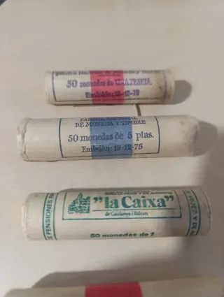 Se vende lote de rollos de monedas antiguas. Escucho ofertas. - Rollos de 50 monedas de pesetas. - Rollos de 50 monedas de 1 peseta. - Incluye rollos de La Caixa y Fábrica Nacional de Moneda y Timbre.