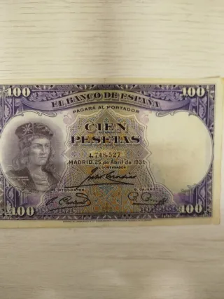 Billete de 100 pesetas del Banco de España, emitido en Madrid el 25 de abril de 1931. - Serie: 4.748.527 - Diseño con retrato. - Texto en español.