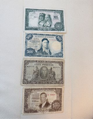 Serie 1Y Serie V Serie H Serie 3X Lote de 4 billetes españoles de Pesetas de la última serie emitida. - Un billete de 1000 Pesetas. - Un billete de 500 Pesetas. - Dos billetes de 100 Pesetas.