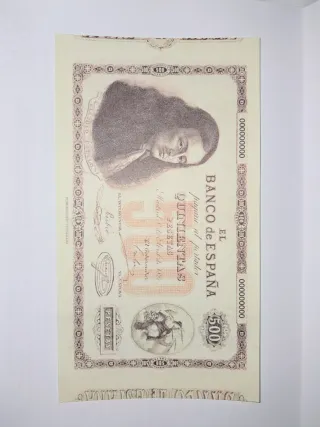 Reproducción de un billete de 500 pesetas del Banco de España. Un detalle histórico para coleccionistas. - Diseño detallado del billete. - Representación de El Gabernudor y El Interno. - Incluye el valor 500 en varios formatos.