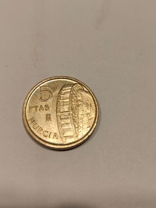 Moneda española de 5 pesetas del año 1999, edición especial de MURCIA. Estado original, no se ha limpiado. Con Error de acuñación por desplazamiento por dibujo tocando el reborde.