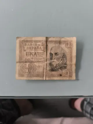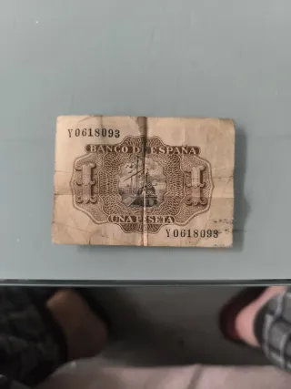 Billete de una peseta español, emitido en julio de 1953. Es un billete antiguo y muestra señales de desgaste por el paso del tiempo. - Billete de colección. - Fecha de emisión: 22 de julio de 1953. - Banco de España.