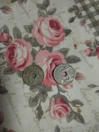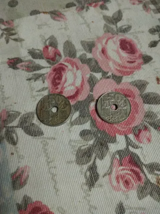 Dos monedas antiguas de España con agujero en el centro. Una está poco pintada - Una moneda de 5 pesetas. - Otra moneda de 25 pesetas.