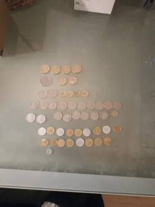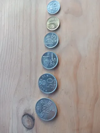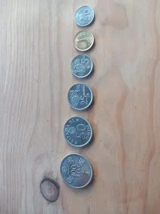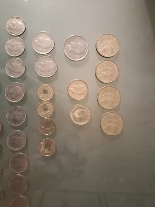 Se venden 34 monedas antiguas de 1 peseta españolas. Son monedas usadas, con señales normales de uso y paso del tiempo. - Monedas de 1 pesetas españolas. - 34 monedas en total. - Se aprecian marcas del paso del tiempo. - Precio Unidad - hay monedas: 1 unidad del 89 1 unidad del 91 3- unidades del 92 1- unidad 94 1- unidad 96 5- unidades 97 12- unidades 98 2- unidades 99 3- unidades 2000 5- unidades 2001
