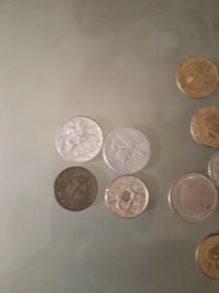 Conjunto de varias monedas antiguas de España. Cada moneda tiene un diseño único y representa una época. - Variedad de tamaños y metales. - Diseños históricos y detalles grabados. -Monedas de Franco de 1 y 5 pesetas de los años entre 1957 y 1966. - 4 monedas anteriores a Franco , 1941, 1944, 1949, 1953. Escucho ofertas.