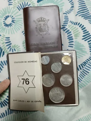 Más en mí perfil 1 por 6€ 2 por 10€ Colección de monedas de España del año 1975, estrella 76 bajo el reinado de Juan Carlos I. - Incluye varias pesetas. - Presentado en una cartera conmemorativa. - Diseño de estrella con el número 76.