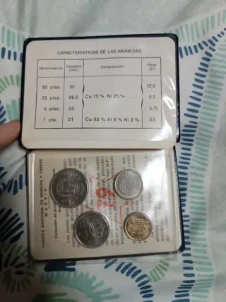Más en mí perfil 1 cartera 6€ Pregunta por más hago precio económico. Cartera de monedas de Pesetas de España del año 1975, con la moneda de la estrella 79. - Incluye tabla de características de las monedas: Denominación, Diámetro (mm), Composición y Peso (g). - Composición de las monedas: Cu 75% Ni 25% y Cu 92% Al 6% Ni 2%. - Fabricada por la Fábrica Nacional de Moneda y Timbre, Madrid.