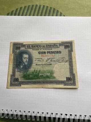 Billete de 100 pesetas del Banco de España, emitido en Madrid el 1 de julio de 1925. - Denominación: Cien Pesetas. - Fecha de emisión: 1 de julio de 1925. - Lugar de emisión: Madrid. - Incluye retrato de Felipe II y vista del Palacio Real.
