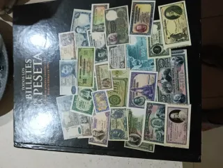 Libro que recopila billetes de la peseta española. - Cubre desde la primera emisión hasta la última en 1992. - Contiene diversos billetes de diferentes valores.