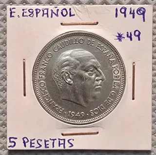 Moneda de 5 pesetas de España del año 1949 *49 - Anverso: Retrato de Francisco Franco. - Reverso: Escudo de España. - Canto: Estrellas y año.