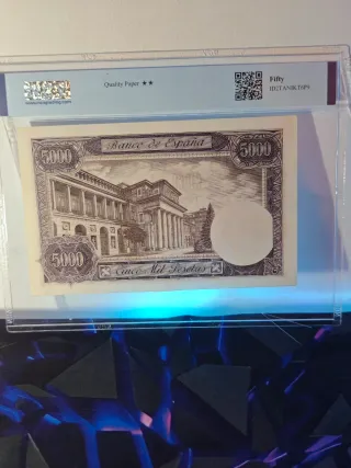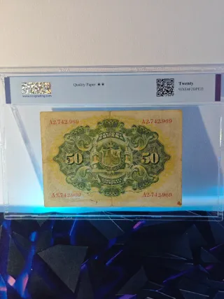 Billete Español, Certificado por NCV, plástico totalmente nuevo, certificados todos por mi, sin rayadas. La descripción del Billete y su calificación aparece en la parte superior de cada billete. ( Primera foto,Certificación ) Terminación del número de serie, 69. Toda la colección de billetes certificados tienen la misma terminación, tanto numeraciones sin serie, con serie, y series especiales. Cualquier duda o consulta, no lo dude! Se envían más fotos si se precisan, se hacen lotes para un mismo envío. Billete español de 50 Pesetas del Banco de España, emitido en 1940 y certificado por NCV con una calificación de 45 Choice Extrem