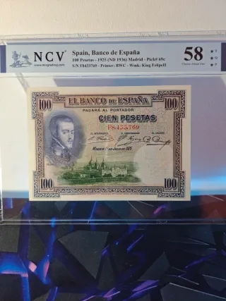 Billete Español, Certificado por NCV, plástico totalmente nuevo, certificados todos por mi, sin rayadas. La descripción del Billete y su calificación aparece en la parte superior de cada billete. ( Primera foto,Certificación ) Terminación del número de serie, 69. Toda la colección de billetes certificados tienen la misma terminación, tanto numeraciones sin serie, con serie, y series especiales. Cualquier duda o consulta, no lo dude! Se envían más fotos si se precisan, se hacen lotes para un mismo envío. - Denominación: 100 Pesetas - Año: 1925 (ND 1936) - Lugar de emisión: Madrid - Número de serie: F8433769 - Marca de agua: Rey Fel