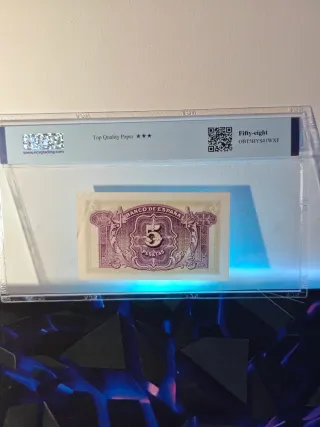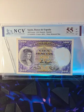 Billete Español, Certificado por NCV, plástico totalmente nuevo, certificados todos por mi, sin rayadas. La descripción del Billete y su calificación aparece en la parte superior de cada billete. ( Primera foto,Certificación ) Terminación del número de serie, 69. Toda la colección de billetes certificados tienen la misma terminación, tanto numeraciones sin serie, con serie, y series especiales. Cualquier duda o consulta, no lo dude! Se envían más fotos si se precisan, se hacen lotes para un mismo envío. - Grado: 55 (About Uncirculated). - Pick #83. - Número de Serie: 8304569. - Impresor: BWC. - Marca de agua: Helmeted Man.