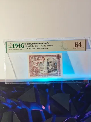 Billete de 1 Peseta de España, emitido por el Banco de España en 1953. Certificado por PMG con una calificación de 64 Choice Uncirculated. - País: España - Banco: Banco de España - Año: 1953 - Denominación: 1 Peseta - Número de catálogo Pick: 144a - Número de serie: 4615369 - Impresor: FNMT - Calificación PMG: 64 Choice Uncirculated