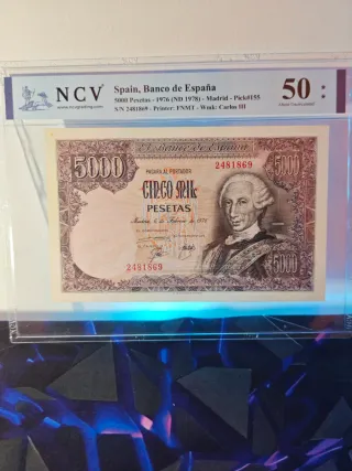 Billete Español, Certificado por NCV, plástico totalmente nuevo, certificados todos por mi, sin rayadas. La descripción del Billete y su calificación aparece en la parte superior de cada billete. ( Primera foto,Certificación ) Terminación del número de serie, 69. Toda la colección de billetes certificados tienen la misma terminación, tanto numeraciones sin serie, con serie, y series especiales. Cualquier duda o consulta, no lo dude! Se envían más fotos si se precisan, se hacen lotes para un mismo envío. - Denominación: 5000 Pesetas - Año: 1976 (ND 1978) - Lugar de emisión: Madrid - Pick: #155 - Número de serie: 2481869 - Impresor: