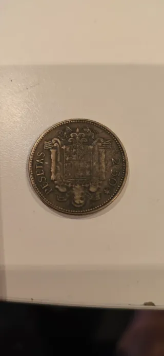Moneda de 250 pesetas con el escudo de España. - Canto con inscripción. - Diseño detallado del escudo.