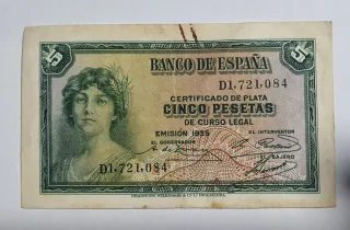 Billete de 5 pesetas del Banco de España, emitido en 1935. - Emisión: 1935 - Denominación: Cinco Pesetas - Impreso por Bradbury, Wilkinson & Co. Ltd. Inglaterra.