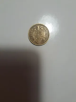 Moneda de una peseta de España. Presenta el escudo de España. - Canto con inscripción. - Diseño detallado del escudo.
