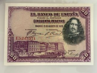 Billete de 50 pesetas del Banco de España, emitido en Madrid el 15 de agosto de 1928. Presenta un retrato de Velázquez. - Serie E, número 5.245.571. - Firma del Gobernador y del Interventor. - Grabado de Bradbury, Wilkinson y Cía, Londres. La aplicación de Wallapop envíos no hace envíos desde Canarias a Peninsula por lo que los envíos gratuitos será por correo ordinario en sobre acorchado y bien protegido. Nunca hemos tenido problemas con el envío ordinario. También envíos por certificado disponible Tiempo estimado 3/4 dias